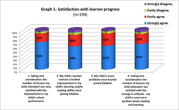 The survey results in Graph 1 show how satisfied customers are with the progress that learners achieve at school. Progress is determined by improvement in school performance, increase in reading and learning abilities, more confidence, and a positive attitude towards learning.